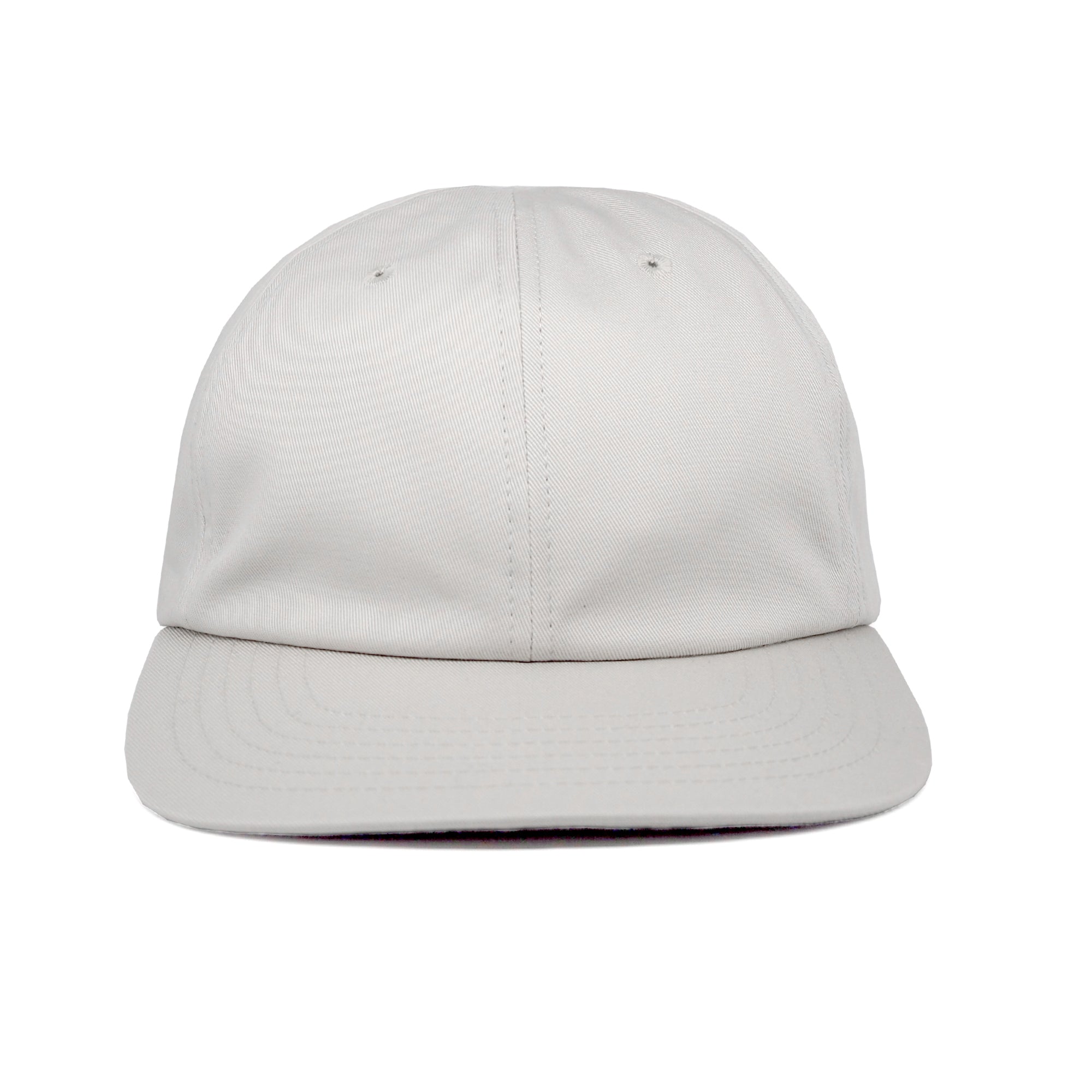 クラウン 15cm、6パネルデザイン、同素材のストラップバックデザイン、真鍮バックルディテール、セミハードブリム、刺繍アイレット、背面刺繍、コットンツイルテープ、インナーバンド、メッシュ裏地、手押しスタンプ、QRコード付きケアラベル、ユニセックス
